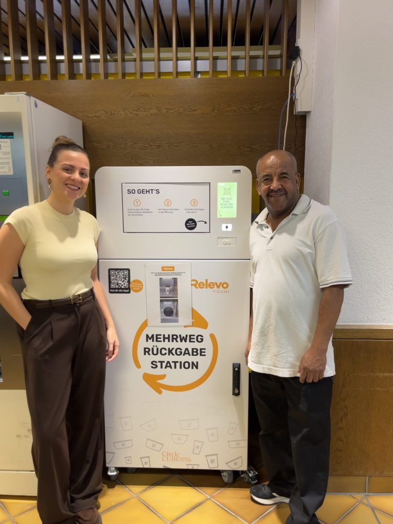 Ab dem 1. Juli 2025 (mit der Eröffnung der neuen Kantine) sollte der gesamte Take-away-Bereich vollständig auf Mehrweg umgestellt werden. Das bedeutete: